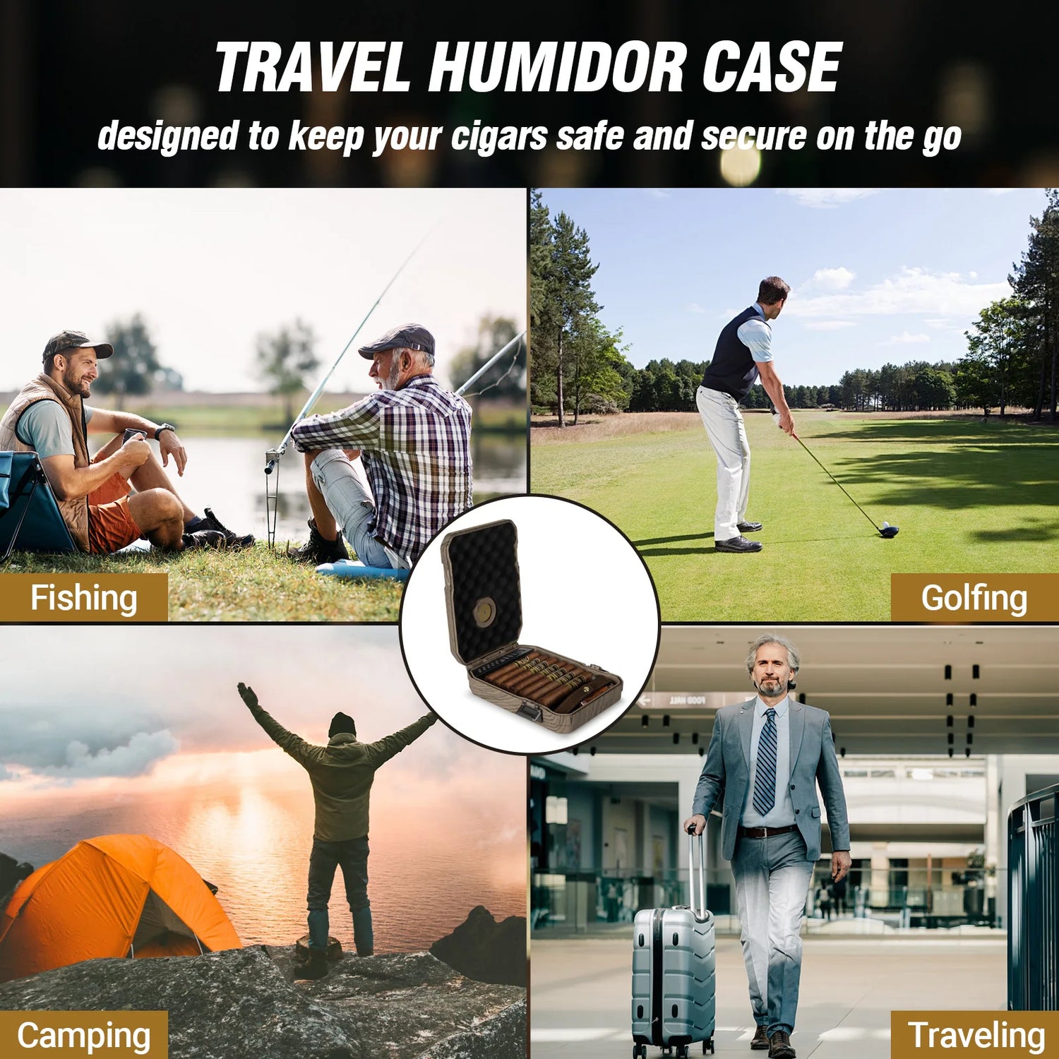 【High-quality Cigar Accessories】Travel cigar humidor comes with cigar humidifier and cigar lighter. The built-in cigar humidifier releases moisture steadily when dripped with the proper amount of distilled water to keep your cigars fresh. The built-in cigar lighter comes with a V-cutter and visible fuel window, providing you with more convenience when enjoying cigars. The adjustable cigar lighter also features a high-quality flame nozzle that can quickly ignite cigars. Good windproof performance makes the cigar lighter work well outdoors. (Butane not included in lighter)