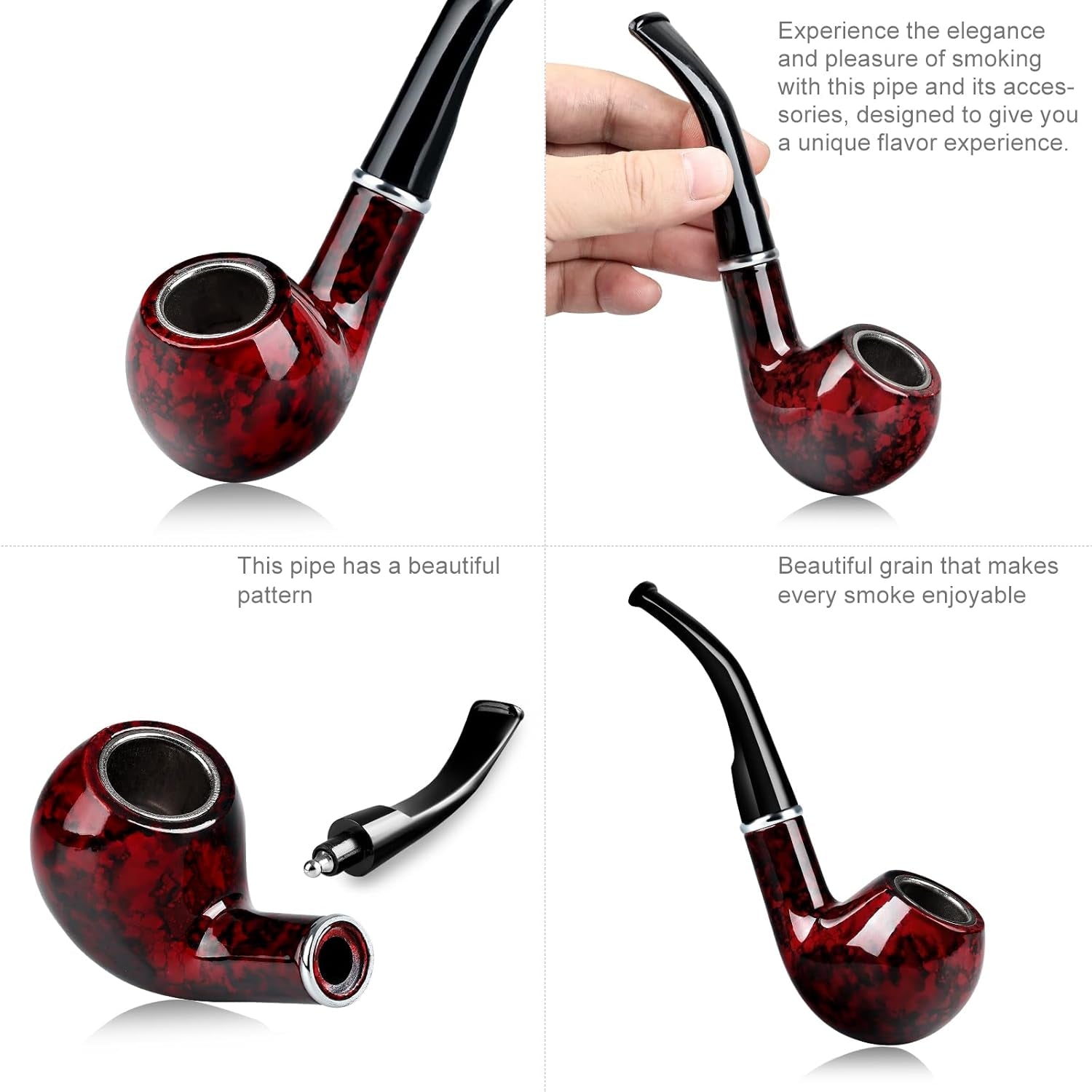 Experience timeless enjoyment with this classic wood tobacco smoking pipe, thoughtfully crafted for everyday use and refined style. The pipe features a polished finish and a distinctive decorative ring, adding a touch of elegance to your smoking ritual. The set includes a convenient foldable X-shaped pipe stand, making it easy to display or carry your pipe wherever you go. Designed for easy disassembly, this pipe simplifies cleaning, ensuring long-lasting performance and consistent enjoyment. The included accessory kit provides everything needed for a complete smoking experience, from pipe bits to cleaners and a handy cork knocker for ash disposal.